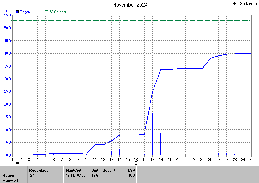 Die gesamte Regenmenge lag bei 40.0l/m² (entspricht: 75.6%) und war damit um -12.9l/m² vom langjährigen Wert entfernt. Niederschlag gab es an 16Tagen. Mehr als 2mm Regen gab es an 5Tagen. Sehr viel Regen mit mehr als 20mm pro Tag gab es an 0Tagen.