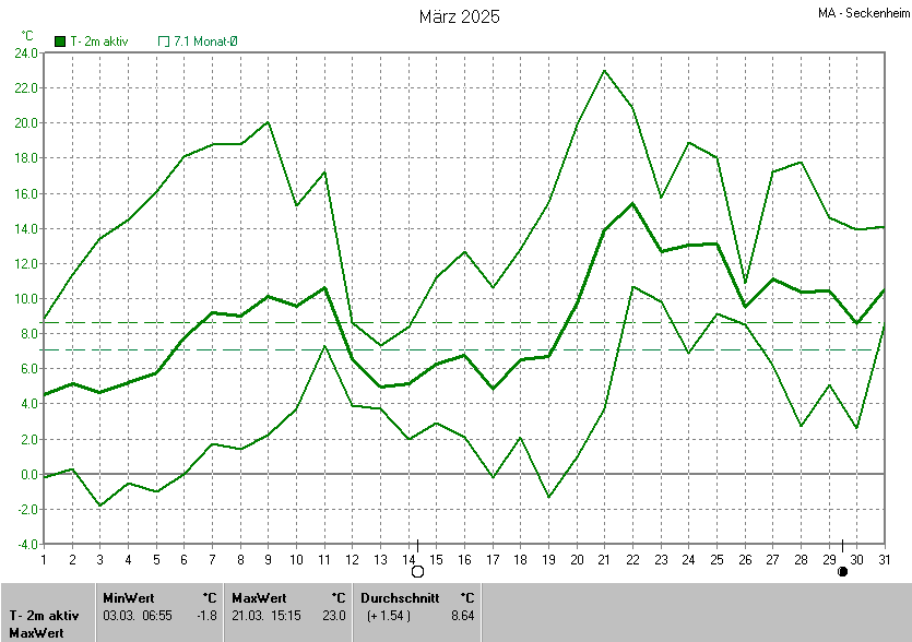 Die Durchschnittstemperatur für den Monat März 2025 lag bei 8.64°C. Die Abweichung vom langjährigen Mittel war +1.54°C.