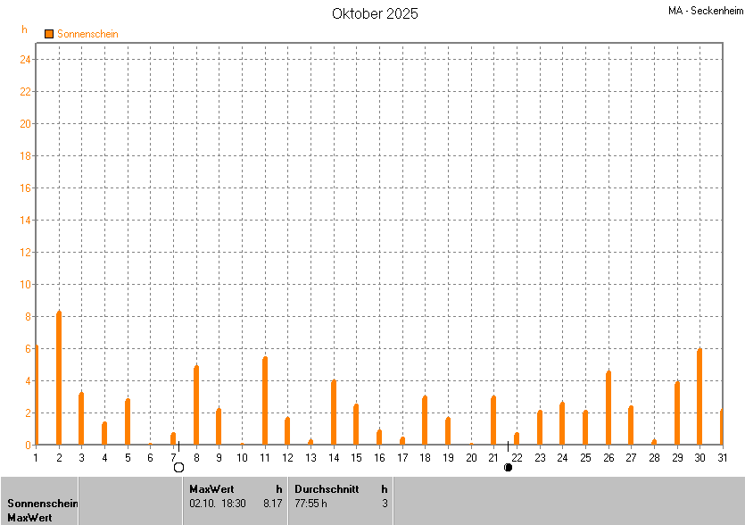 Dargestellt wird die grafische Übersicht für die Sonnenscheinzeit. Zu sehen sind immer die täglichen Sonnenstunden (von 0-24 Uhr):