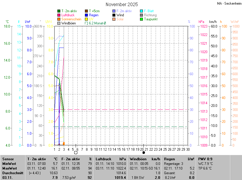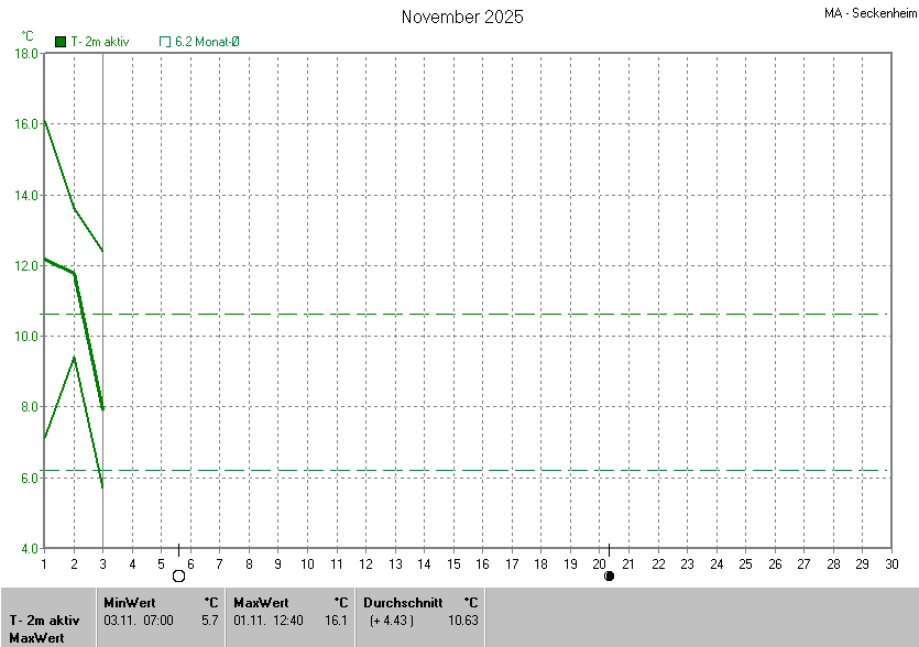Der wärmste Tag war der 01.11.2025 um 12:40 mit 16.1°C. Am kältesten war es mit 6.2°C am 03.11.2025 um 06:00.