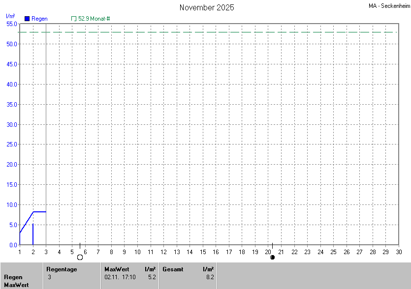 Die gesamte Regenmenge lag bei 8.2l/m² (entspricht: 15.5%) und war damit um -44.7l/m² vom langjährigen Wert entfernt. Niederschlag gab es an 2Tagen. Mehr als 2mm Regen gab es an 2Tagen. Sehr viel Regen mit mehr als 20mm pro Tag gab es an 0Tagen.