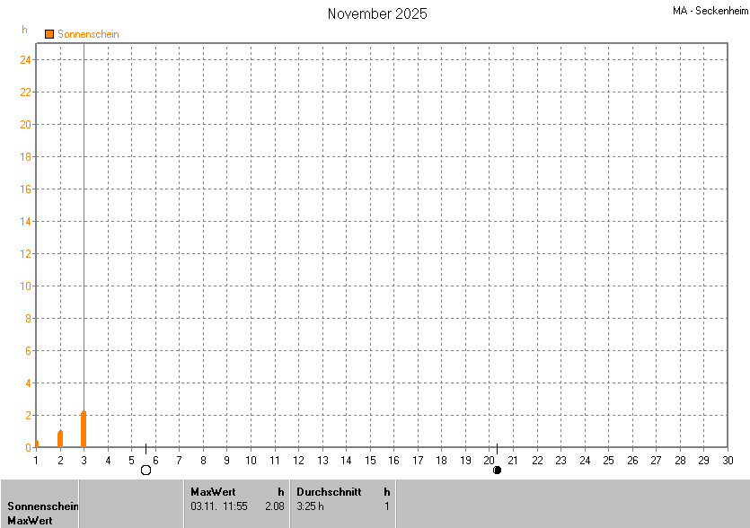 Dargestellt wird die grafische Übersicht für die Sonnenscheinzeit. Zu sehen sind immer die täglichen Sonnenstunden (von 0-24 Uhr):
