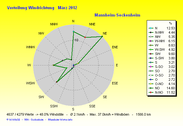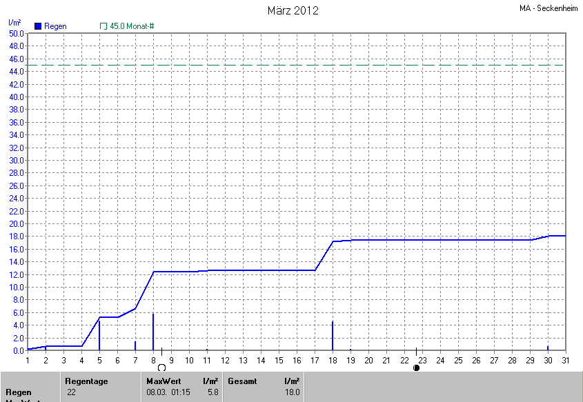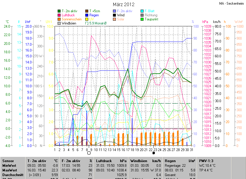 Der wärmste Tag war der 16.03.2012 um 15:40 mit 22.3°C. Am kältesten war es mit -0.8°C am 09.03.2012 um 05:50.