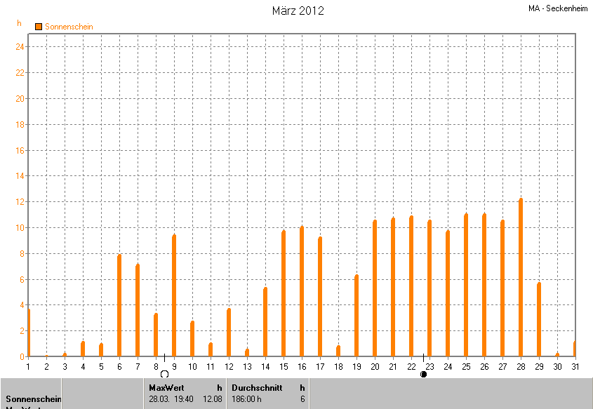 Dargestellt wird die grafische Übersicht für die Sonnenscheinzeit. Zu sehen sind immer die täglichen Sonnenstunden (von 0-24 Uhr):