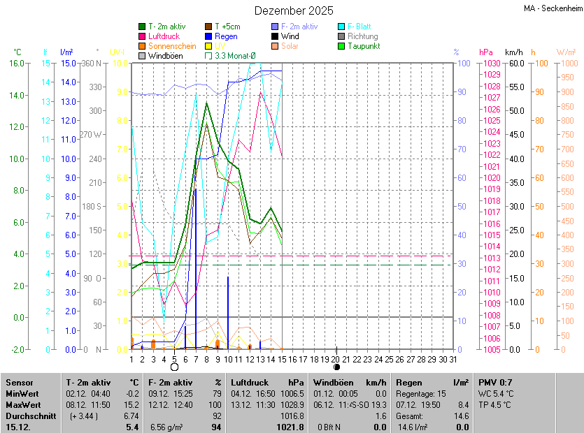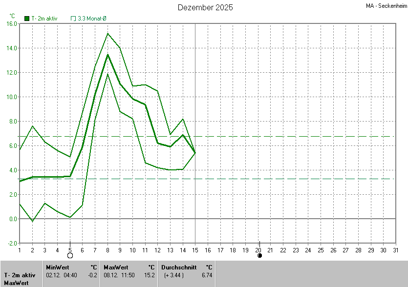 Der wärmste Tag war der 08.12.2025 um 11:50 mit 15.2°C. Am kältesten war es mit -0.2°C am 02.12.2025 um 04:40.