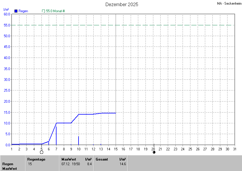 Die gesamte Regenmenge lag bei 14.6l/m² (entspricht: 26.5%) und war damit um -40.4l/m² vom langjährigen Wert entfernt. Niederschlag gab es an 8Tagen. Mehr als 2mm Regen gab es an 2Tagen. Sehr viel Regen mit mehr als 20mm pro Tag gab es an 0Tagen.