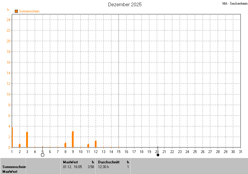 Dargestellt wird die grafische Übersicht für die Sonnenscheinzeit. Zu sehen sind immer die täglichen Sonnenstunden (von 0-24 Uhr):