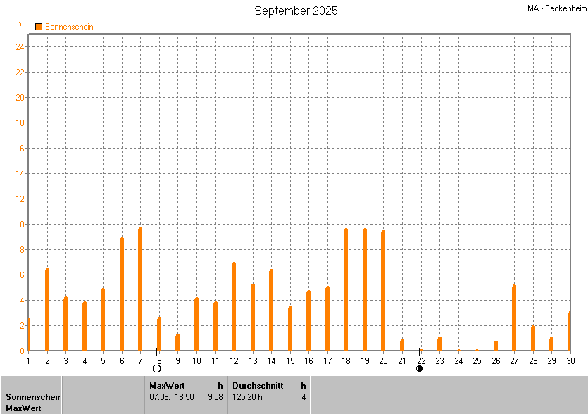 Dargestellt wird die grafische Übersicht für die Sonnenscheinzeit. Zu sehen sind immer die täglichen Sonnenstunden (von 0-24 Uhr):