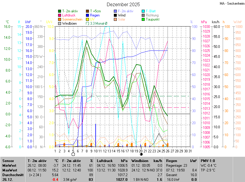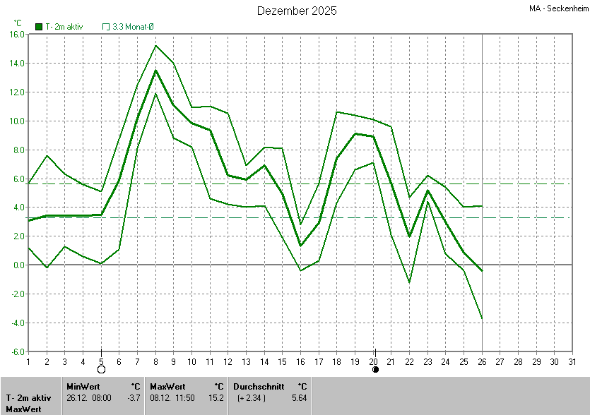 Die Durchschnittstemperatur für den Monat Dezember 2025 lag bei 5.64°C. Die Abweichung vom langjährigen Mittel war +2.34°C.