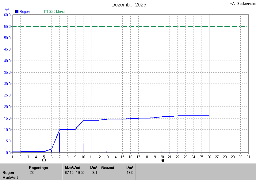 Die gesamte Regenmenge lag bei 16.0l/m² (entspricht: 29.1%) und war damit um -39.0l/m² vom langjährigen Wert entfernt. Niederschlag gab es an 14Tagen. Mehr als 2mm Regen gab es an 2Tagen. Sehr viel Regen mit mehr als 20mm pro Tag gab es an 0Tagen.
