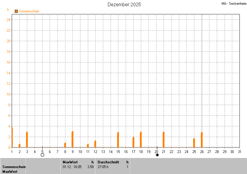 Dargestellt wird die grafische Übersicht für die Sonnenscheinzeit. Zu sehen sind immer die täglichen Sonnenstunden (von 0-24 Uhr):