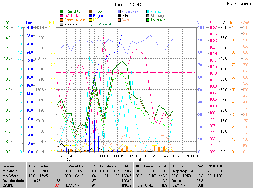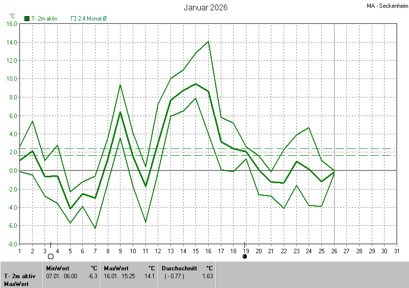 Der wärmste Tag war der 16.01.2026 um 15:25 mit 14.1°C. Am kältesten war es mit -6.3°C am 07.01.2026 um 06:00.