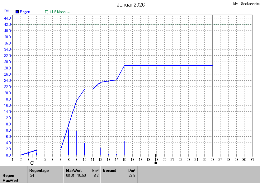 Die gesamte Regenmenge lag bei 28.8l/m² (entspricht: 68.7%) und war damit um -13.1l/m² vom langjährigen Wert entfernt. Niederschlag gab es an 9Tagen. Mehr als 2mm Regen gab es an 5Tagen. Sehr viel Regen mit mehr als 20mm pro Tag gab es an 0Tagen.