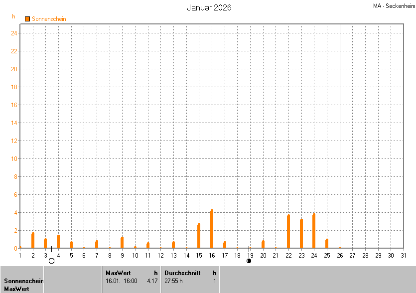 Dargestellt wird die grafische Übersicht für die Sonnenscheinzeit. Zu sehen sind immer die täglichen Sonnenstunden (von 0-24 Uhr):