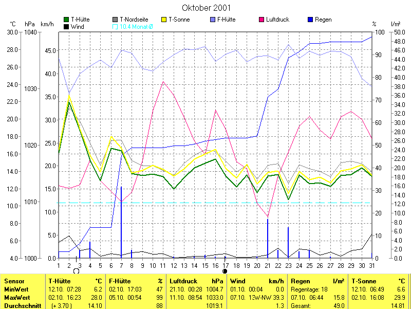 Der wärmste Tag war der 02.10.2001 um 16:23 mit 28.0°C. Am kältesten war es mit 6.2°C am 12.10.2001 um 07:28.