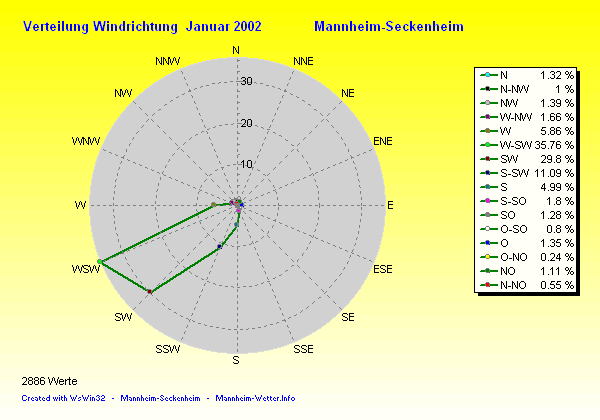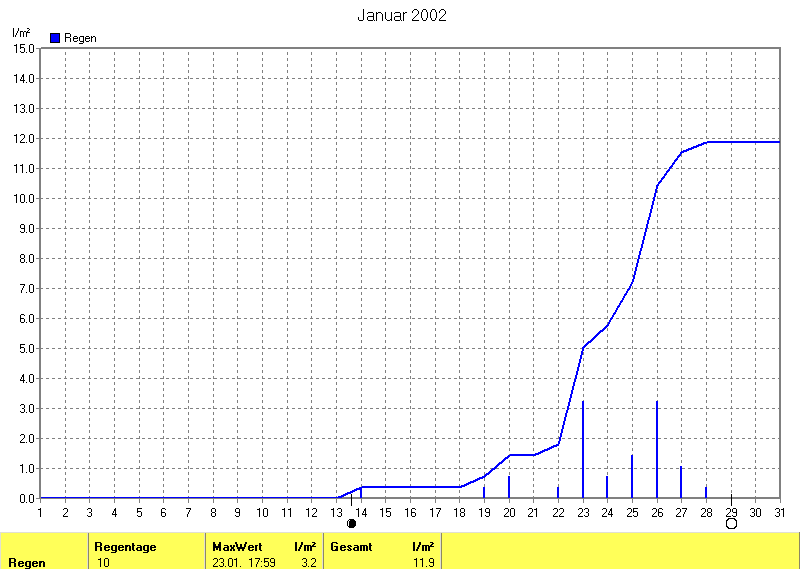 Der wärmste Tag war der 28.01.2002 um 13:43 mit 15.0°C. Am kältesten war es mit -15.1°C am 06.01.2002 um 07:05.