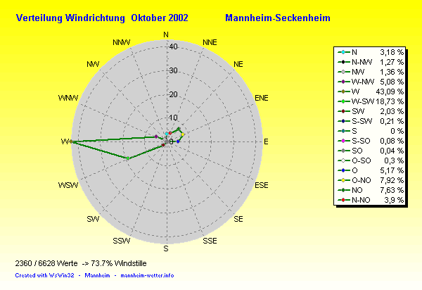 Die Durchschnittstemperatur für den Monat Oktober 2002 lag bei 10.89°C. Die Abweichung vom langjährigen Mittel war +0.49°C.