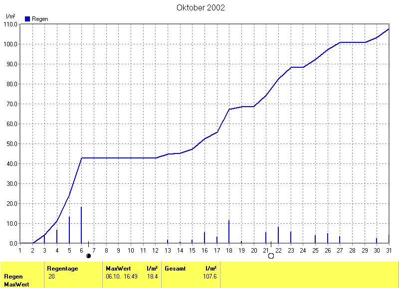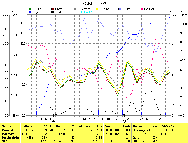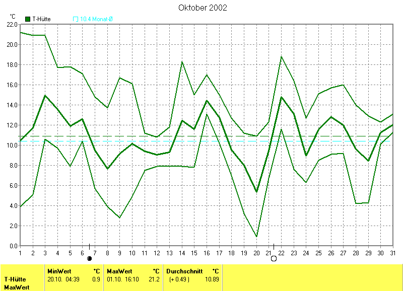 Der wärmste Tag war der 01.10.2002 um 16:10 mit 21.2°C. Am kältesten war es mit 0.9°C am 20.10.2002 um 04:39.