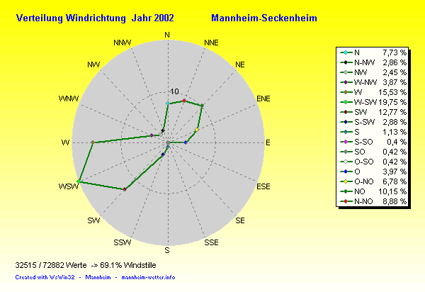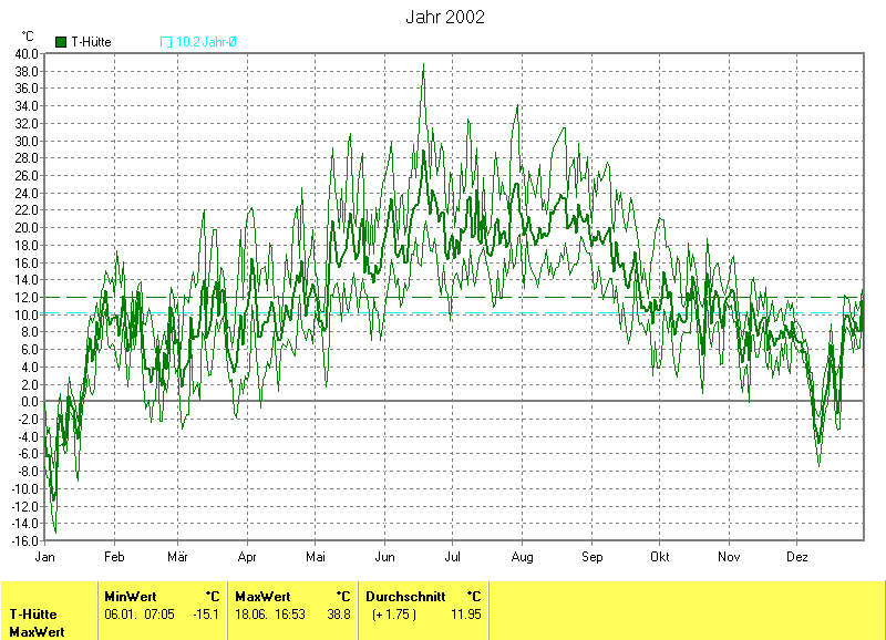 Am wärmsten war es am 18.06.2002 um 16:53 mit 38.8°C. Am kältesten mit -15.1°C am 06.01.2002 um 07:05.