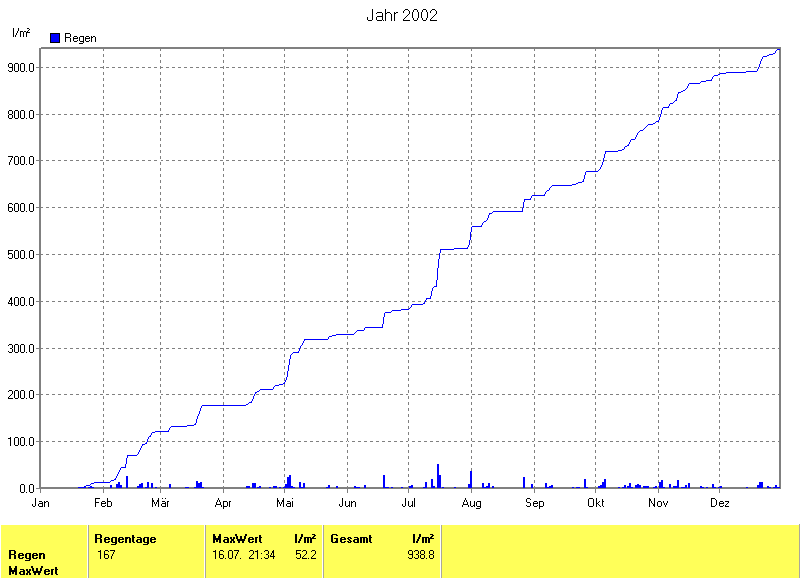 Die gesamte Regenmenge lag bei 942.7l/m² ( 140.9%) und war damit um +273.7l/m² vom langjährigen Wert entfernt. Niederschlag gab es an 169Tagen. Mehr als 2mm Regen gab es an 101Tagen. Sehr viel Regen mit mehr als 20mm pro Tag gab es an 8Tagen.