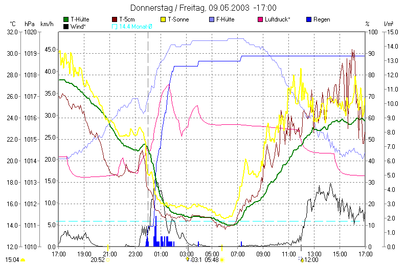 Die Grafik zeigt u.a. den Temperaturverlauf und die Regenmenge: