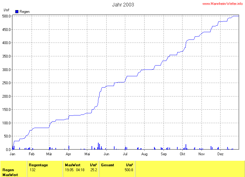 Die gesamte Regenmenge lag bei 500.8l/m² ( 74.9%) und war damit um -168.2l/m² vom langjährigen Wert entfernt. Niederschlag gab es an 132Tagen. Mehr als 2mm Regen gab es an 66Tagen. Sehr viel Regen mit mehr als 20mm pro Tag gab es an 2Tagen.