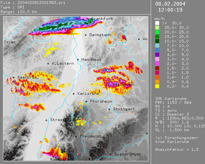 Die Darstellung der Blitzaktivität von 12:00 bis 14:00 Uhr von BLIDS.de