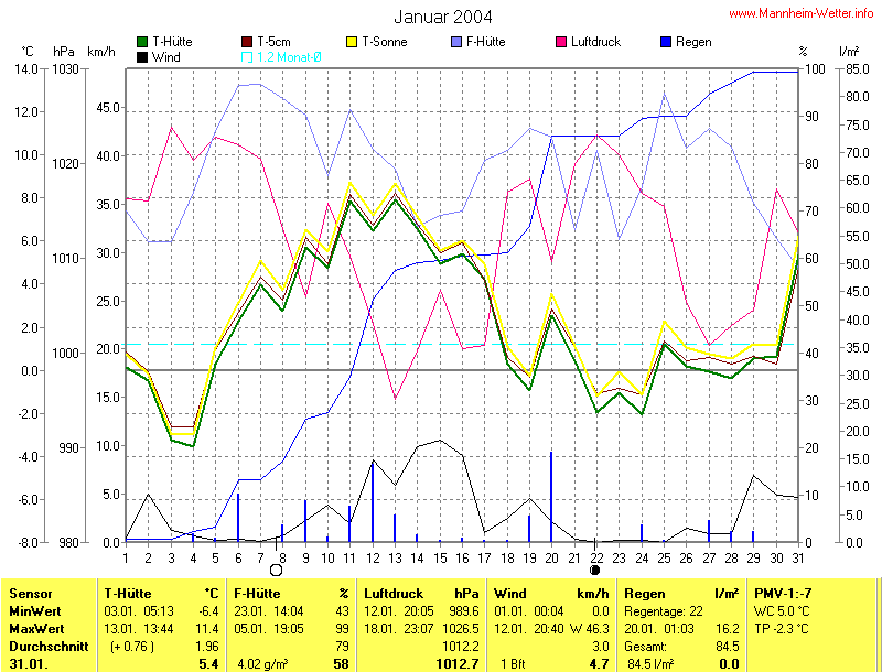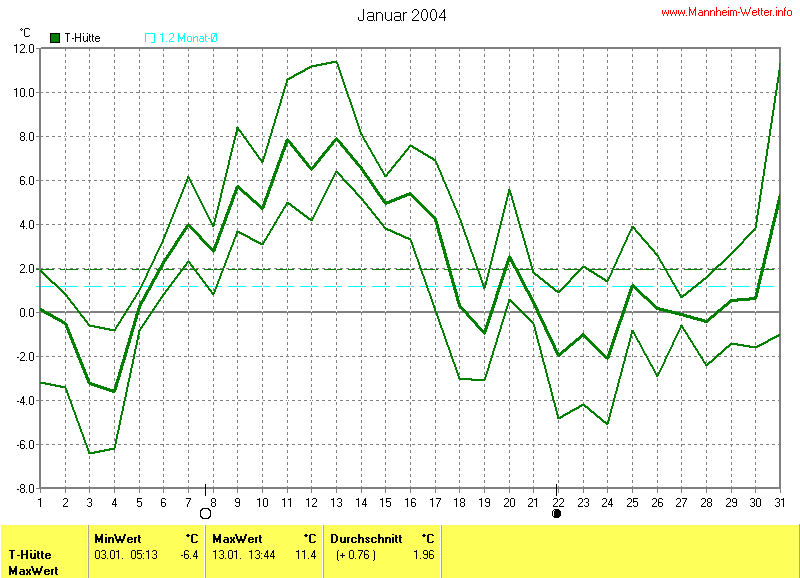 Der wärmste Tag war der 13.01.2004 um 13:44 mit 11.4°C. Am kältesten war es mit -6.4°C am 03.01.2004 um 05:13.