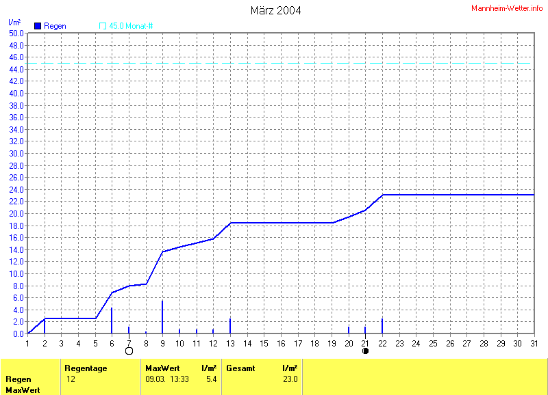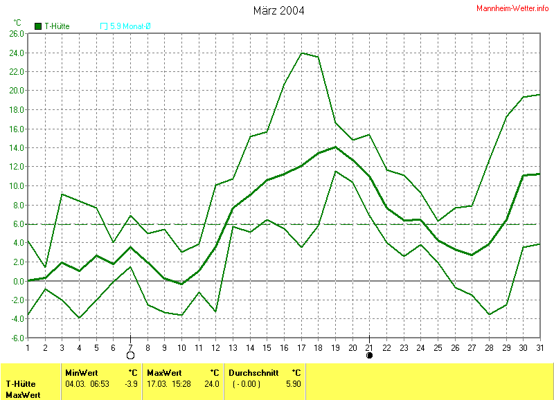 Der wärmste Tag war der 17.03.2004 um 15:28 mit 24.0°C. Am kältesten war es mit -3.9°C am 04.03.2004 um 06:53.