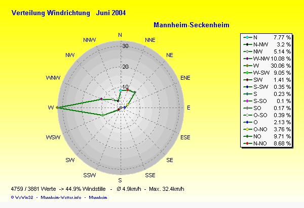 Der wärmste Tag war der 09.06.2004 um 16:11 mit 35.1°C. Am kältesten war es mit 8.2°C am 06.06.2004 um 05:11.