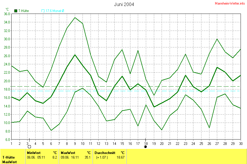 Die Durchschnittstemperatur für den Monat Juni 2004 lag bei 18.67°C. Die Abweichung vom langjährigen Mittel war +1.07°C.