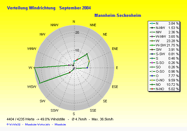 Der wärmste Tag war der 04.09.2004 um 16:19 mit 29.9°C. Am kältesten war es mit 6.5°C am 17.09.2004 um 05:10.