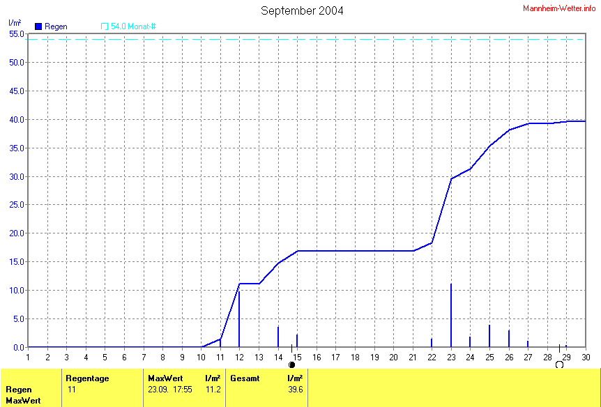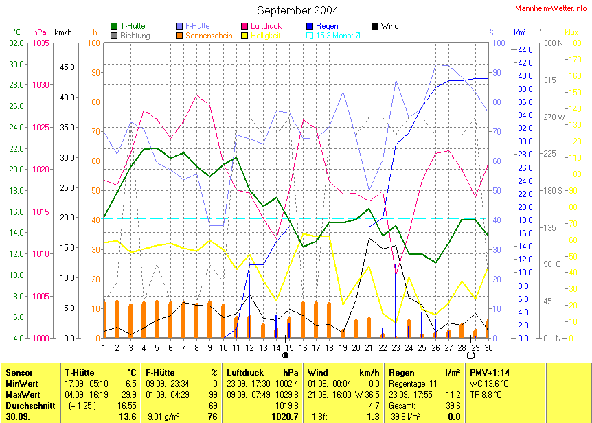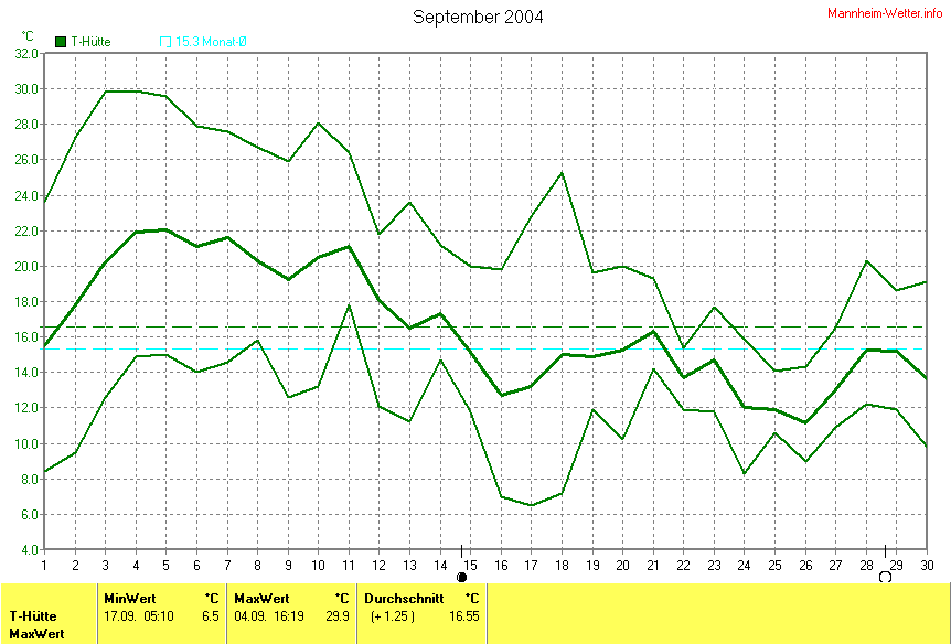 Die Durchschnittstemperatur für den Monat September 2004 lag bei 16.55°C. Die Abweichung vom langjährigen Mittel war +1.25°C.