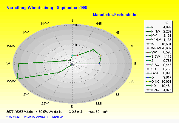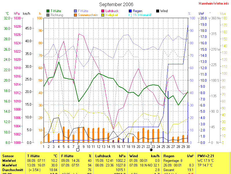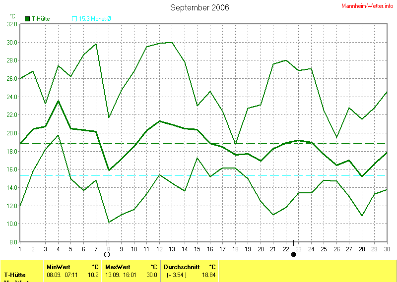 Der wärmste Tag war der 13.09.2006 um 16:01 mit 30.0°C. Am kältesten war es mit 10.2°C am 08.09.2006 um 07:11.