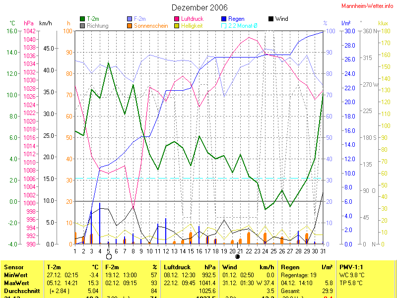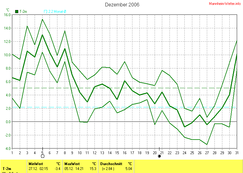 Der wärmste Tag war der 05.12.2006 um 14:21 mit 15.3°C. Am kältesten war es mit -3.4°C am 27.12.2006 um 02:15.