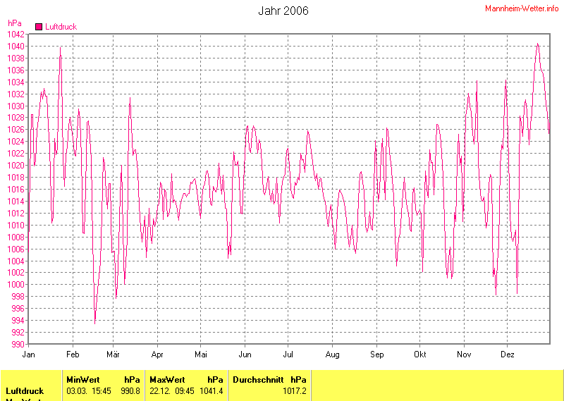 Am wärmsten war es am 26.07.2006 um 15:49 mit 37.2°C. Am kältesten mit -9.3°C am 16.01.2006 um 08:19.