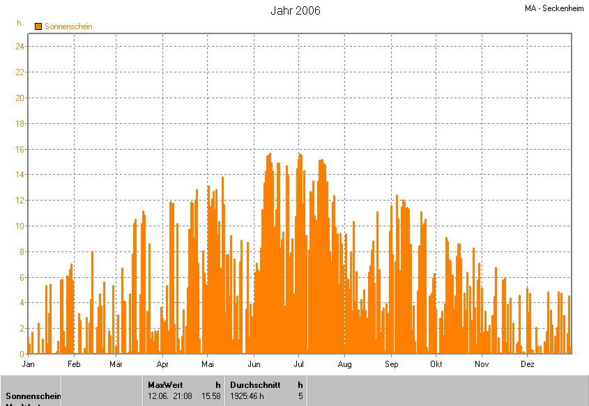 Dargestellt wird die grafische Übersicht für die Sonnenscheinzeit. Zu sehen sind immer die täglichen Zeiten (von 0-24 Uhr):