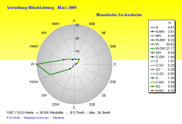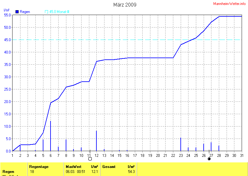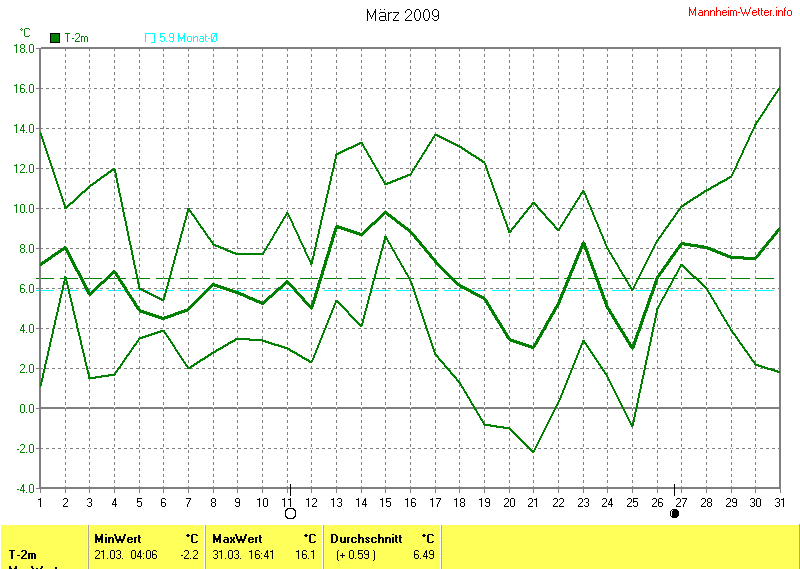 Die Durchschnittstemperatur für den Monat März 2009 lag bei 6.49°C. Die Abweichung vom langjährigen Mittel war +0.59°C.