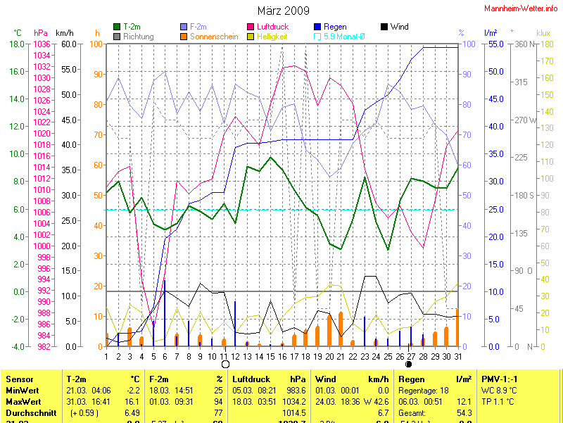 Der wärmste Tag war der 31.03.2009 um 16:41 mit 16.1°C. Am kältesten war es mit -2.2°C am 21.03.2009 um 04:06.