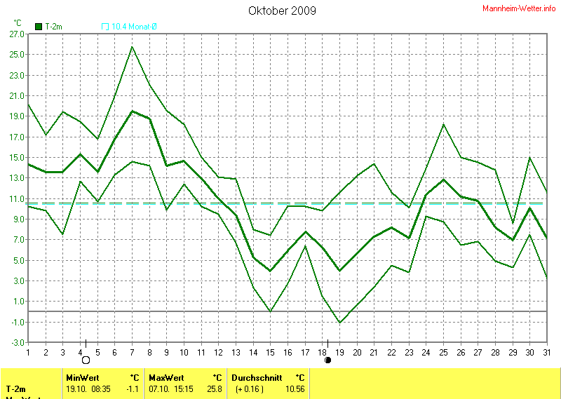 Der wärmste Tag war der 07.10.2009 um 15:15 mit 25.8°C. Am kältesten war es mit -1.1°C am 19.10.2009 um 08:35.