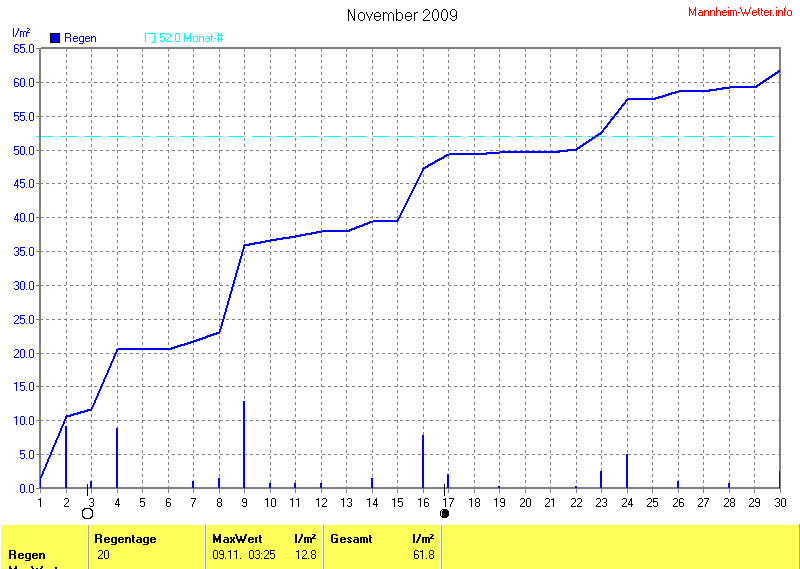 Die Durchschnittstemperatur für den Monat November 2009 lag bei 9.04°C. Die Abweichung vom langjährigen Mittel war +3.84°C.