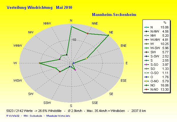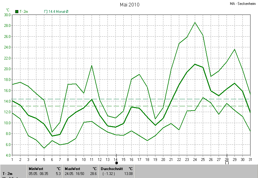Der wärmste Tag war der 24.05.2010 um 16:50 mit 28.6°C. Am kältesten war es mit 5.3°C am 05.05.2010 um 06:35.