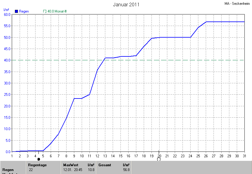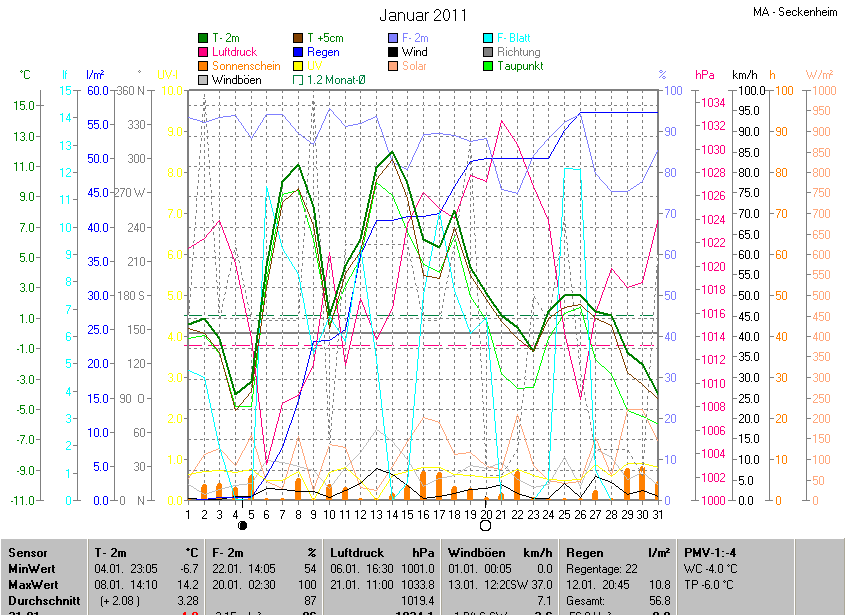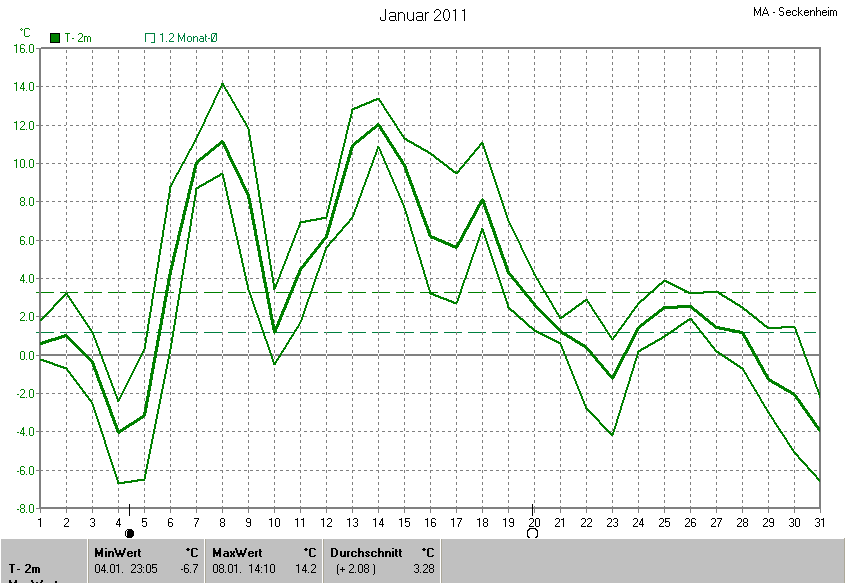 Der wärmste Tag war der 08.01.2011 um 14:10 mit 14.2°C. Am kältesten war es mit -6.7°C am 04.01.2011 um 23:05.