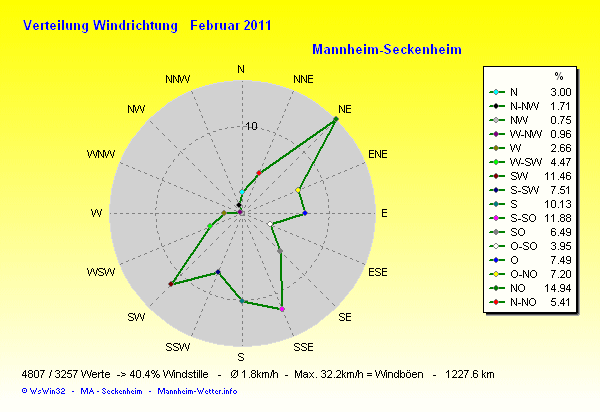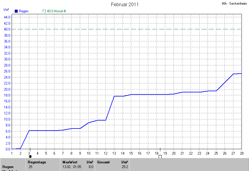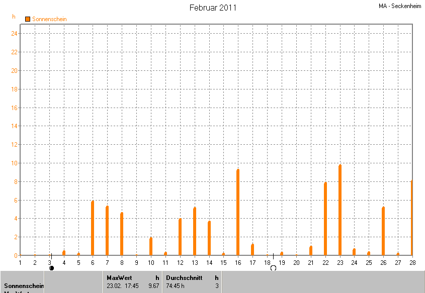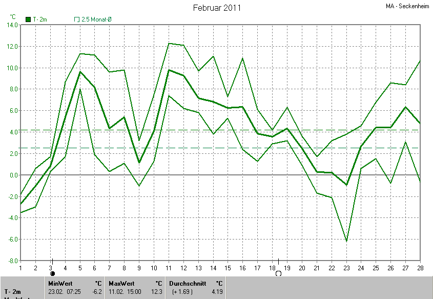 Der wärmste Tag war der 11.02.2011 um 15:00 mit 12.3°C. Am kältesten war es mit -6.2°C am 23.02.2011 um 07:25.