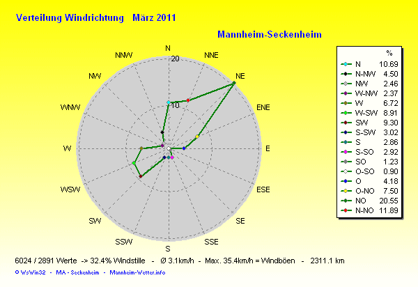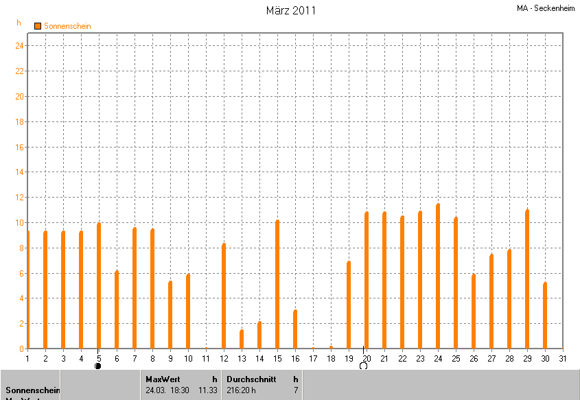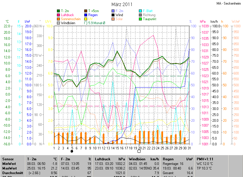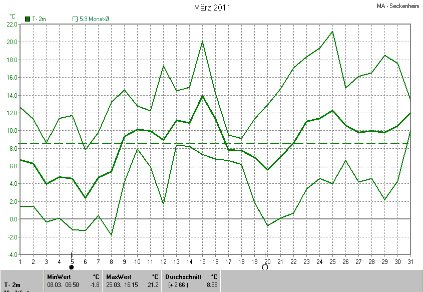 Der wärmste Tag war der 25.03.2011 um 16:15 mit 21.2°C. Am kältesten war es mit -1.8°C am 08.03.2011 um 06:50.