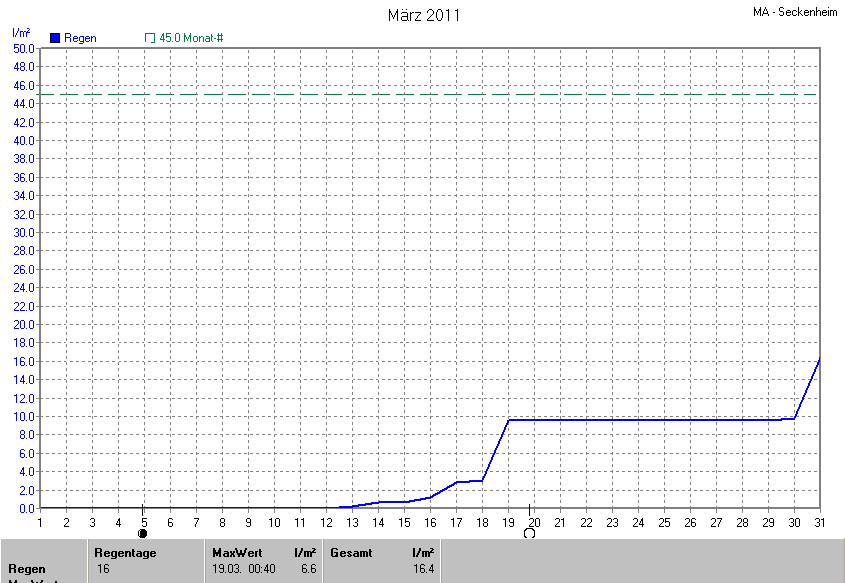 Die gesamte Regenmenge lag bei 16.4l/m² (entspricht: 36.4%) und war damit um -28.6l/m² vom langjährigen Wert entfernt. Niederschlag gab es an 8Tagen. Mehr als 2mm Regen gab es an 2Tagen. Sehr viel Regen mit mehr als 20mm pro Tag gab es an 0Tagen.