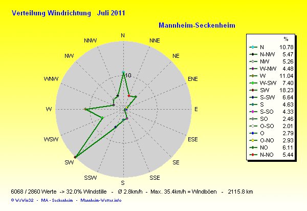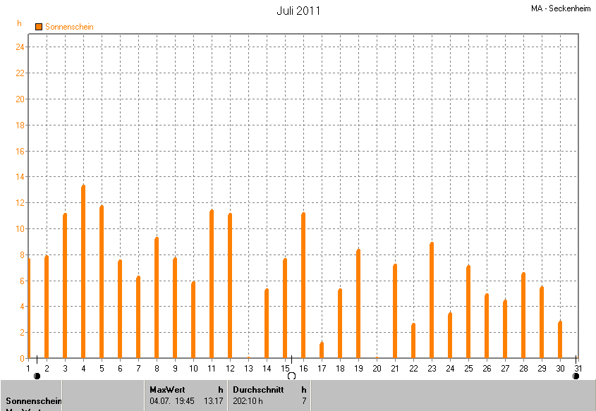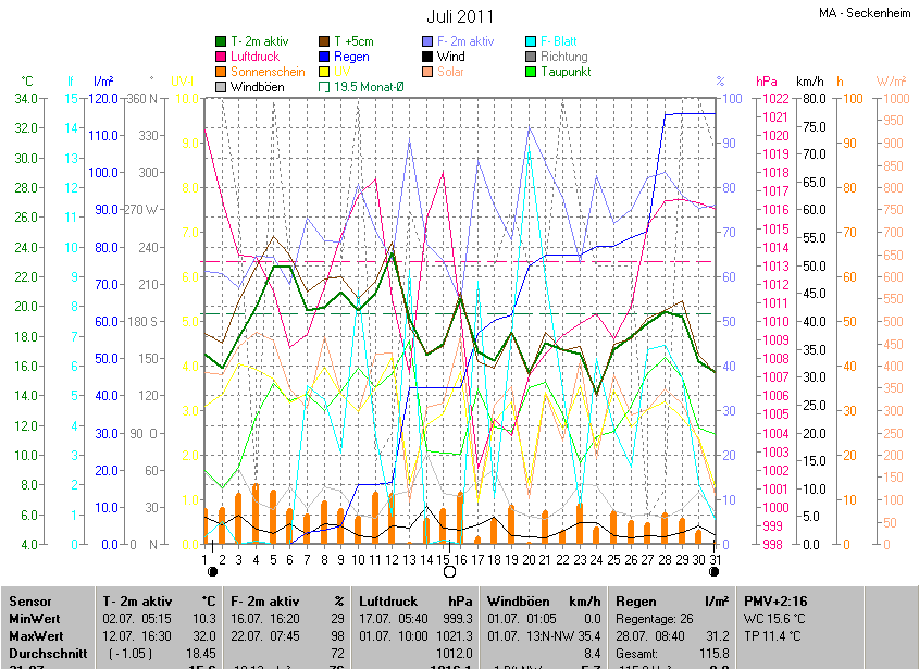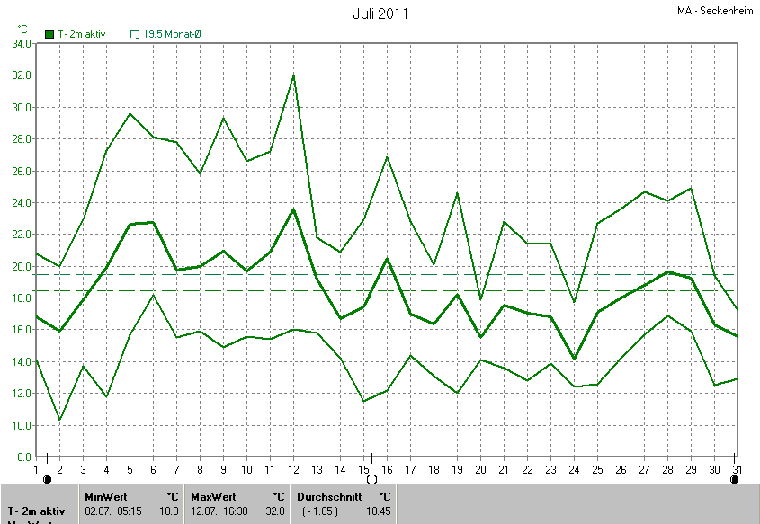 Der wärmste Tag war der 12.07.2011 um 16:30 mit 32.0°C. Am kältesten war es mit 10.3°C am 02.07.2011 um 05:15.