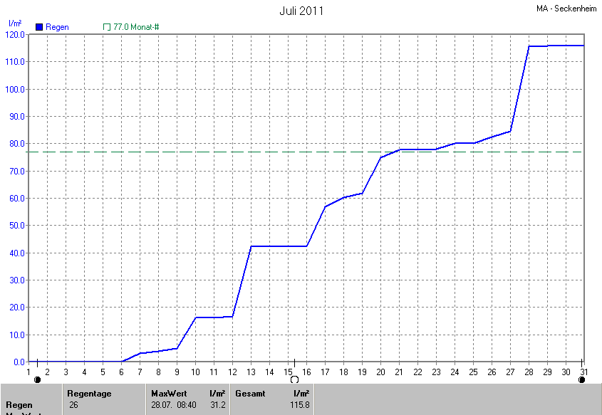 Die gesamte Regenmenge lag bei 115.8l/m² (entspricht: 150.4%) und war damit um +38.8l/m² vom langjährigen Wert entfernt. Niederschlag gab es an 17Tagen. Mehr als 2mm Regen gab es an 11Tagen. Sehr viel Regen mit mehr als 20mm pro Tag gab es an 2Tagen.