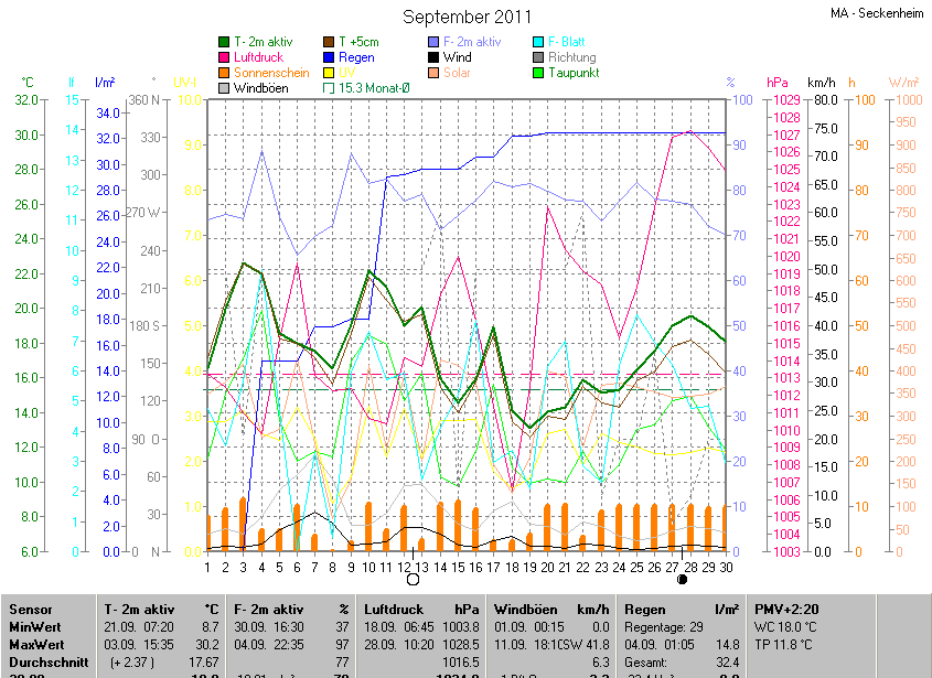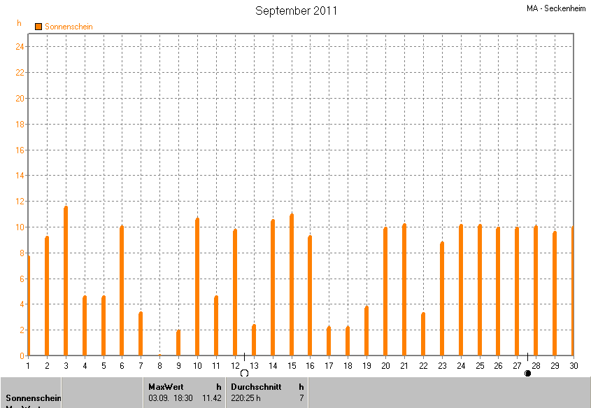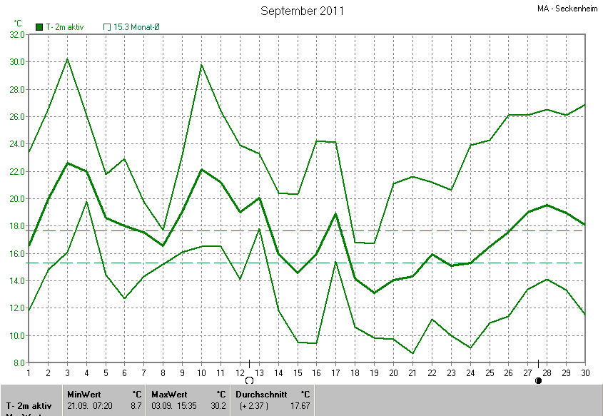 Der wärmste Tag war der 03.09.2011 um 15:35 mit 30.2°C. Am kältesten war es mit 8.7°C am 21.09.2011 um 07:20.