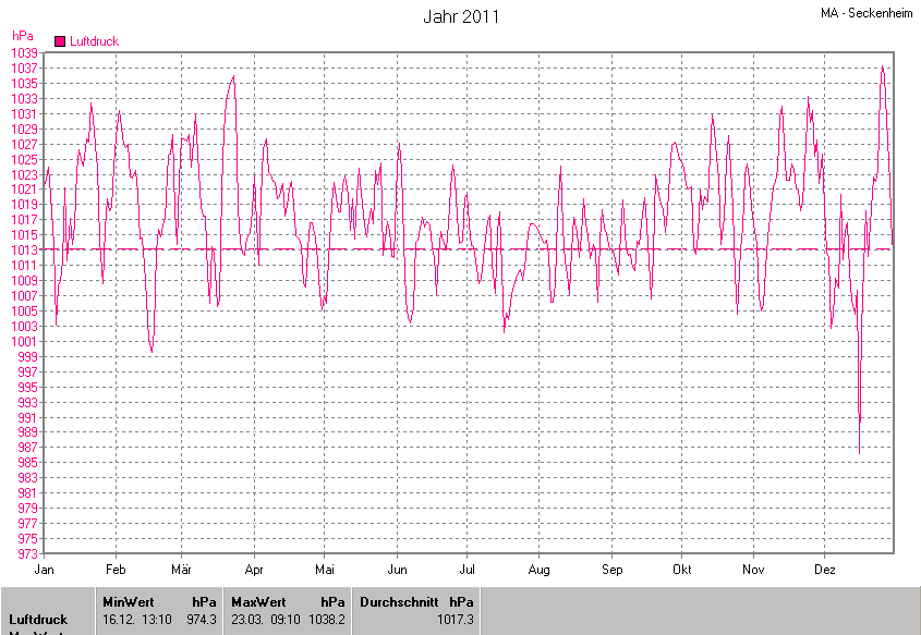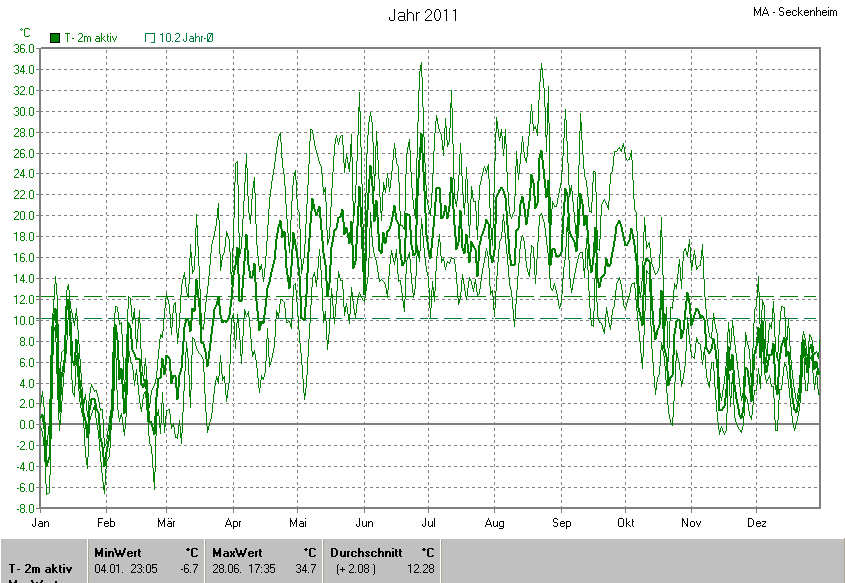 Die Durchschnittstemperatur für das Jahr 2011 lag bei 12.28°C. Die Abweichung vom langjährigen Mittel war +2.08°C.